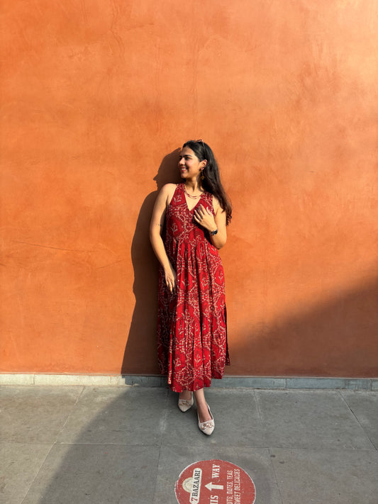 Our sleeveless dresses are crafted in breathable cotton and hand block printed...
