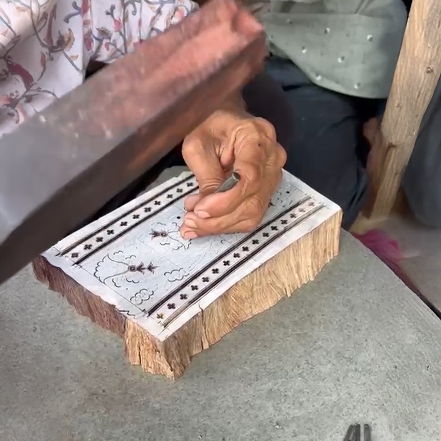 Our artisans start by selecting seasoned wood, which is carefully planed and sanded to achieve a perfectly smooth surface. The block is then coated with a chalk-based paste, allowing the design to be hand-traced with precision.