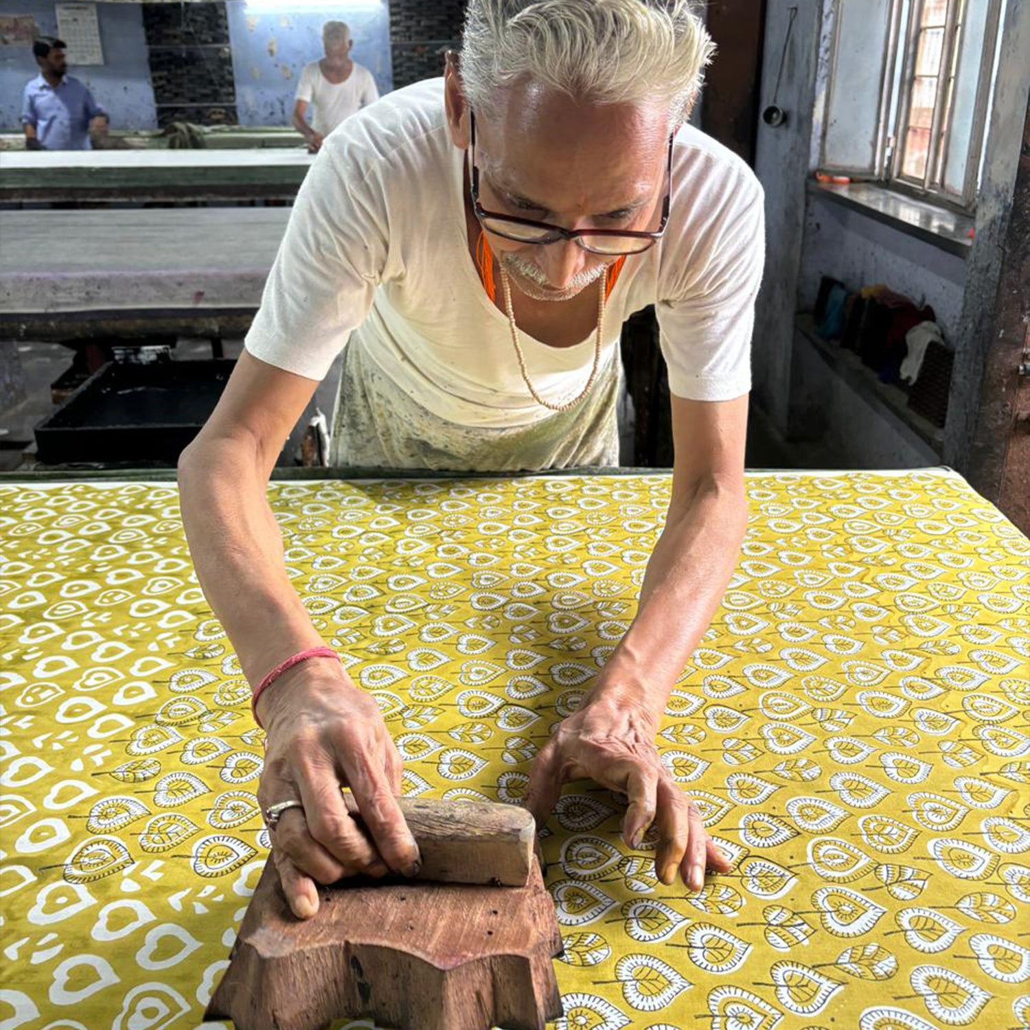 From wood block carvers and master block printers to dyers and finishers, our textiles are created through a slow, intentional process. These layered hand techniques give our garments their distinctive character, depth, and soul—making every piece subtly unique.