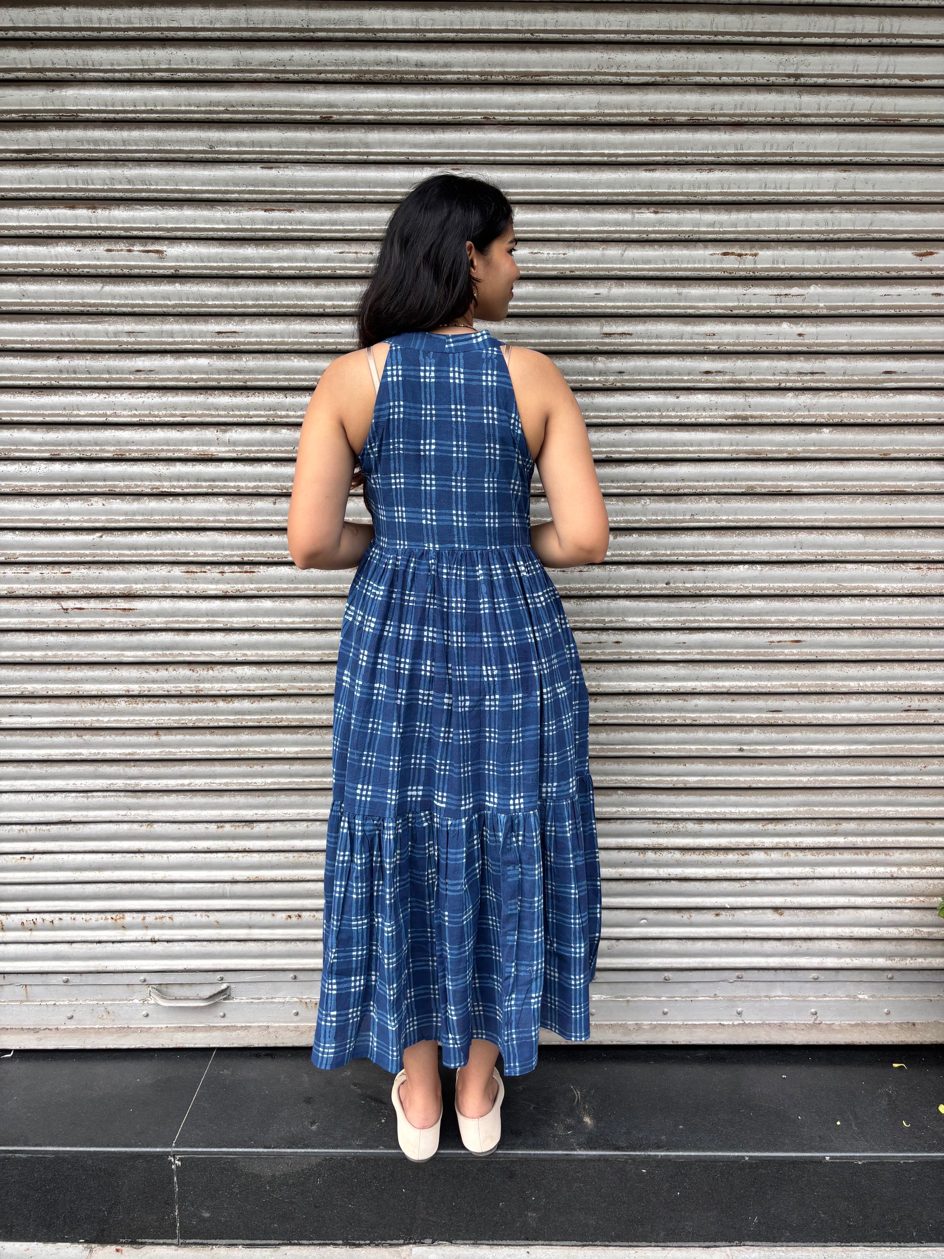 Indigo Hand Block Printed Cotton Halter Neck Dress