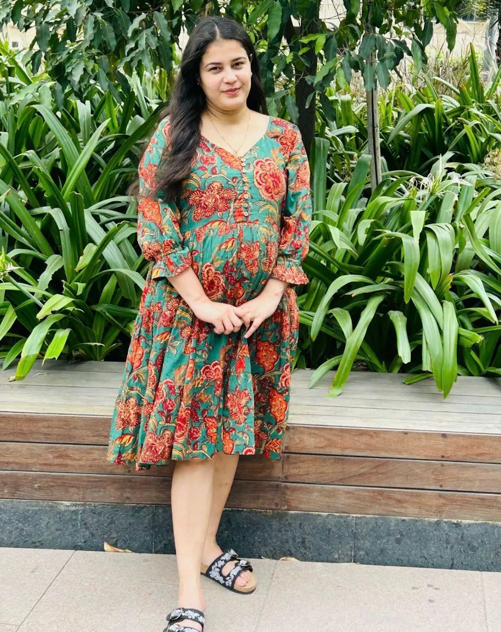 Dark Green Sanganeri Block Print Cotton A-Line Flared Dress