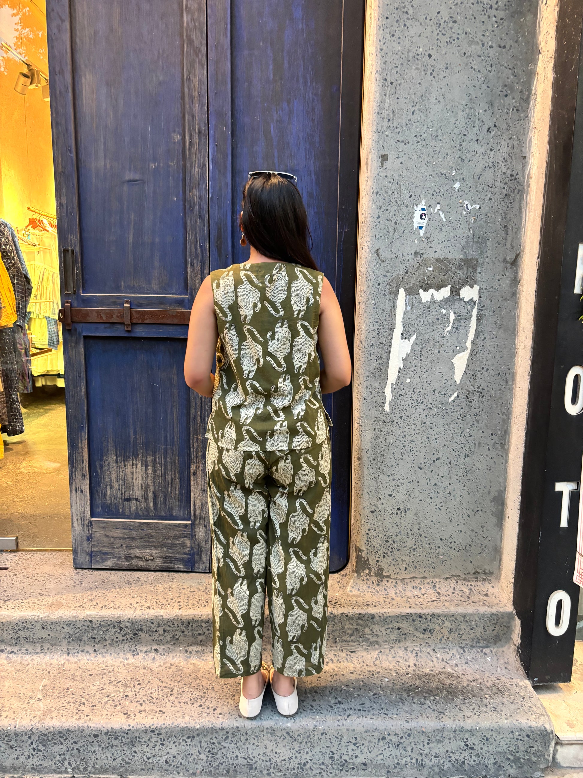Olive Green Bagru Tiger Print Cotton Mulmul 2 Pc Co-ord set