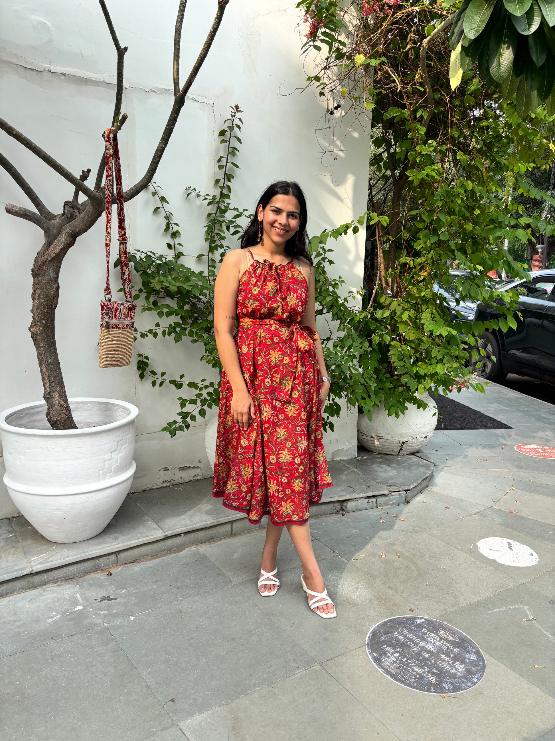 Red Sanganeri Jaal Print Cotton Free Size Dress with Belt