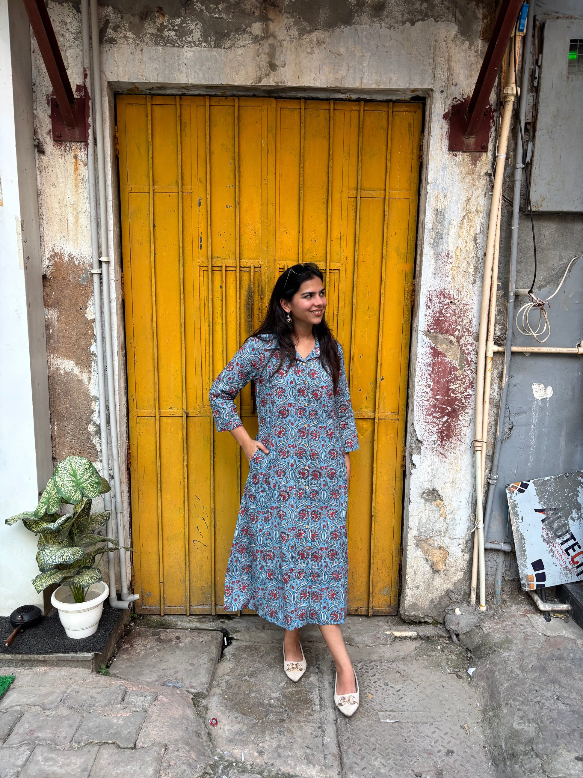 Blue Sanganeri Hand Block Printed Cotton Button-up A-Line Dress