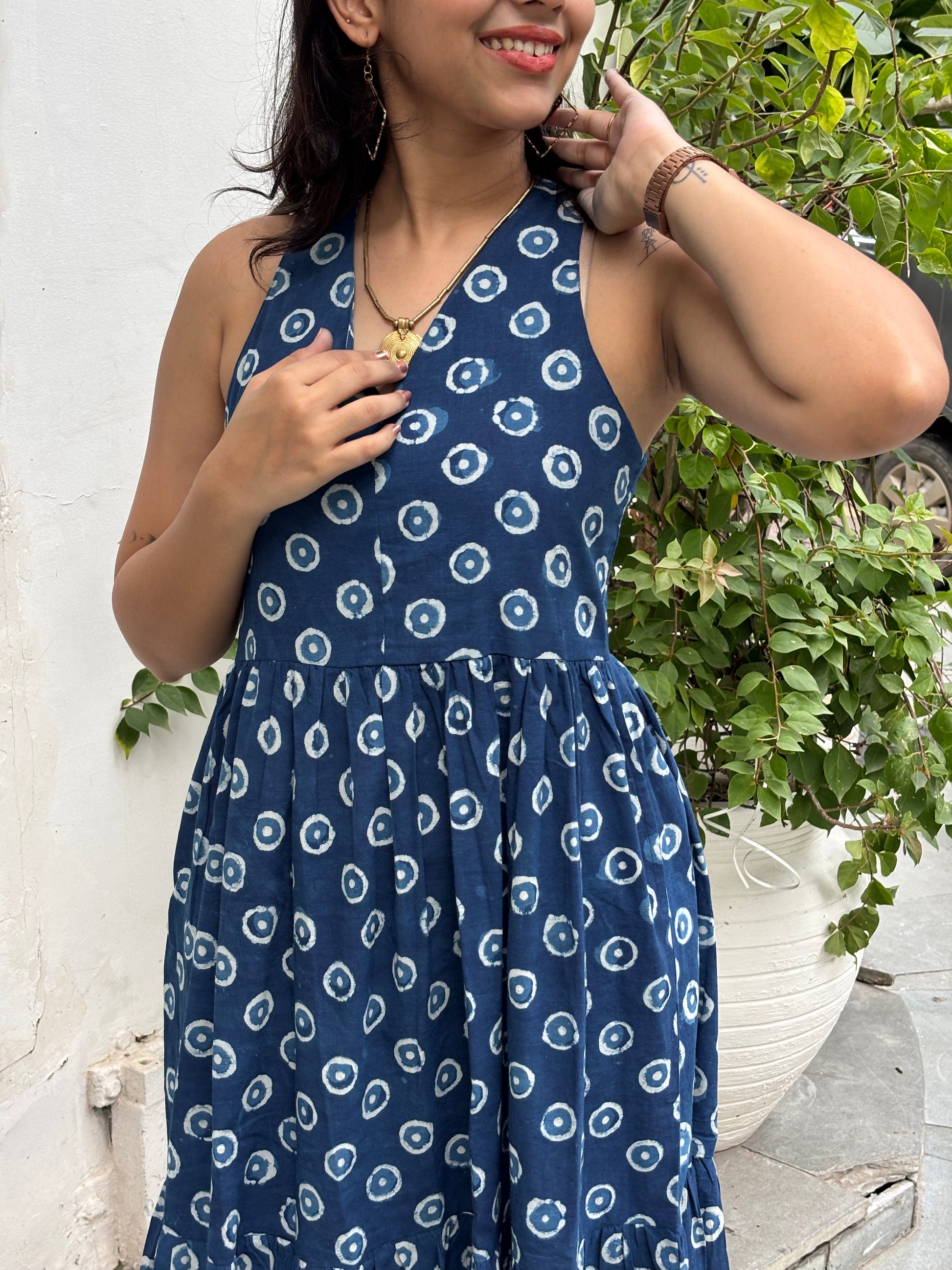 Indigo Hand Block Printed Cotton Halter Neck Dress