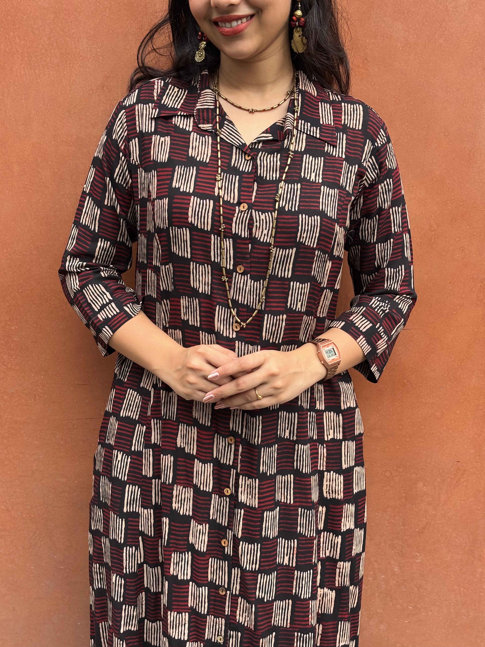 Black & Red Ajrakh Hand Block Printed Cotton Modal Collar A-Line Dress